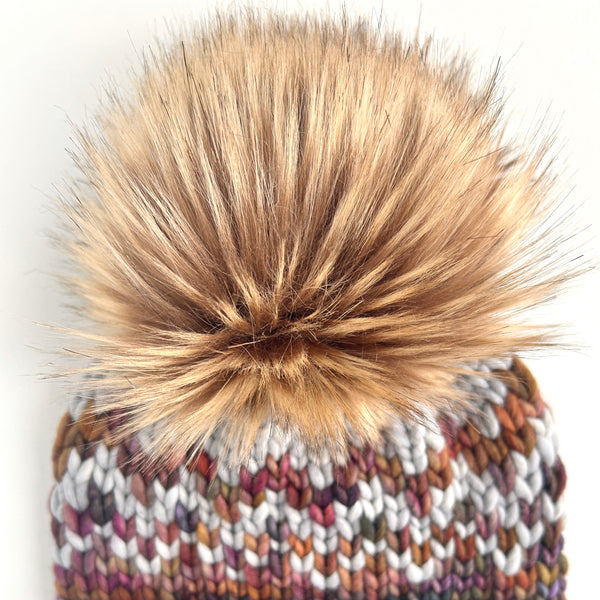 100% Merino Wool, 100% Faux Fur Pom. Hand wash/spot clean cold in gentle detergent, reshape and air dry flat. Do not submerge pom in water. Never hang, rub or twist your knitwear. Do not put in a washing machine or dryer - this will cause your wool item to felt. Use a hair dry on cool or a comb to re-fluff or shape your pom. All wool will stretch out over time, if you feel your item has gotten too stretched out, follow the instructions above to wash it, reshape it to your desired shape and allow to dry.