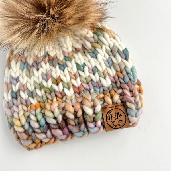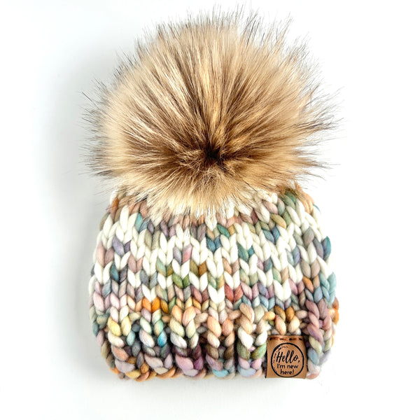 This hat is ready to ship! You will receive this exact hat, made from 100% Merino Wool, topped with an incredibly fluffy, faux fur pom & an ultra leather ‘Hello, I’m New Here’ tag.