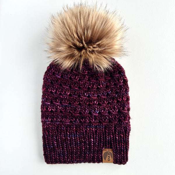 100% Merino Wool. 100% Faux fur pom. Handwash/Spot Clean when necessary. Reshape & lay or hang to dry. Do not submerge pom in water. Use of a hair dryer is recommended to re-fluff or shape your pom.